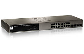 * 16 Port 10/100/1000 Mbps Gigabit Switch mit 4 gemeinsam genutzten SFP Steckplätzen
